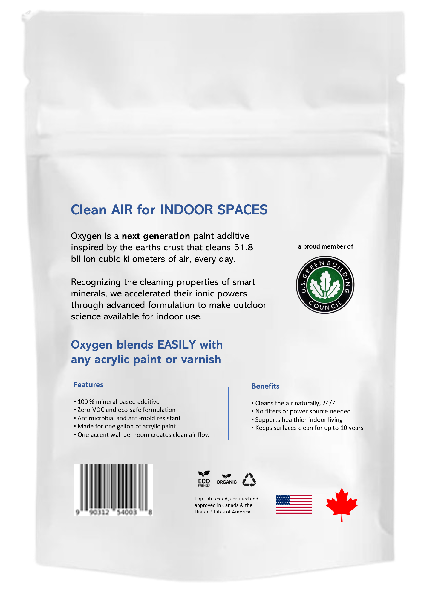 Benefits: When mixed with acrylic paint and applied on surface areas such as walls, ceilings and trims, Oxygen provides an invisible layer of protection against surface and airborne bacteria and pollution in any size room, for as long as the integrity of the paint is maintained. Oxygens specially formulated nano particles are designed to blend seamlessly into any acrylic paint, effectively capturing and neutralizing harmful elements including allergens, mold, and bad odder. Oxygen has undergone rigorous testing in top US and Canadian microbiology and disease control labs using ISO 22196 standard protocol and is proven to be a reliable and effective way to create a cleaner and more comfortable indoor environment.