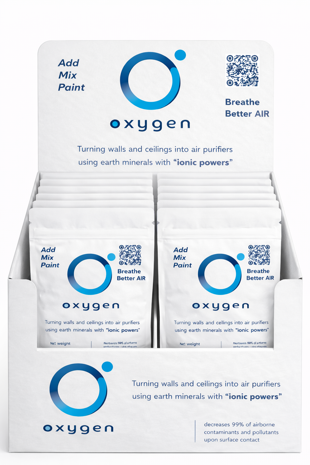 Oxygen is a smart, minerals-based additive scientifically recognized for its ingredients reactive function to actively neutralize harmful surface bacteria, mold and pollutants, promoting a healthier, cleaner environment. By simply adding Oxygen to any acrylic paint and applying it on walls or ceilings, you can transform any room into a healthier and fresher environment.