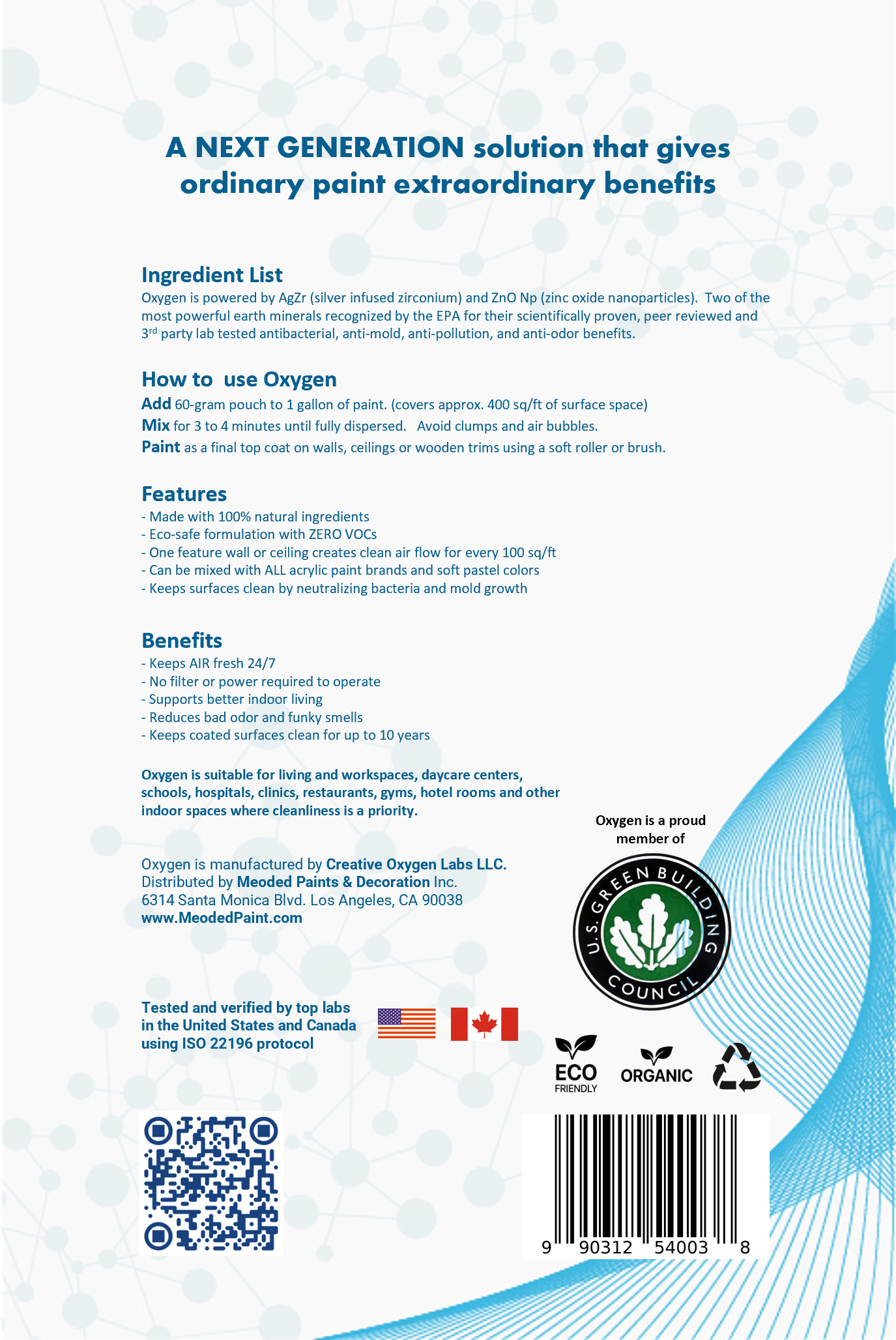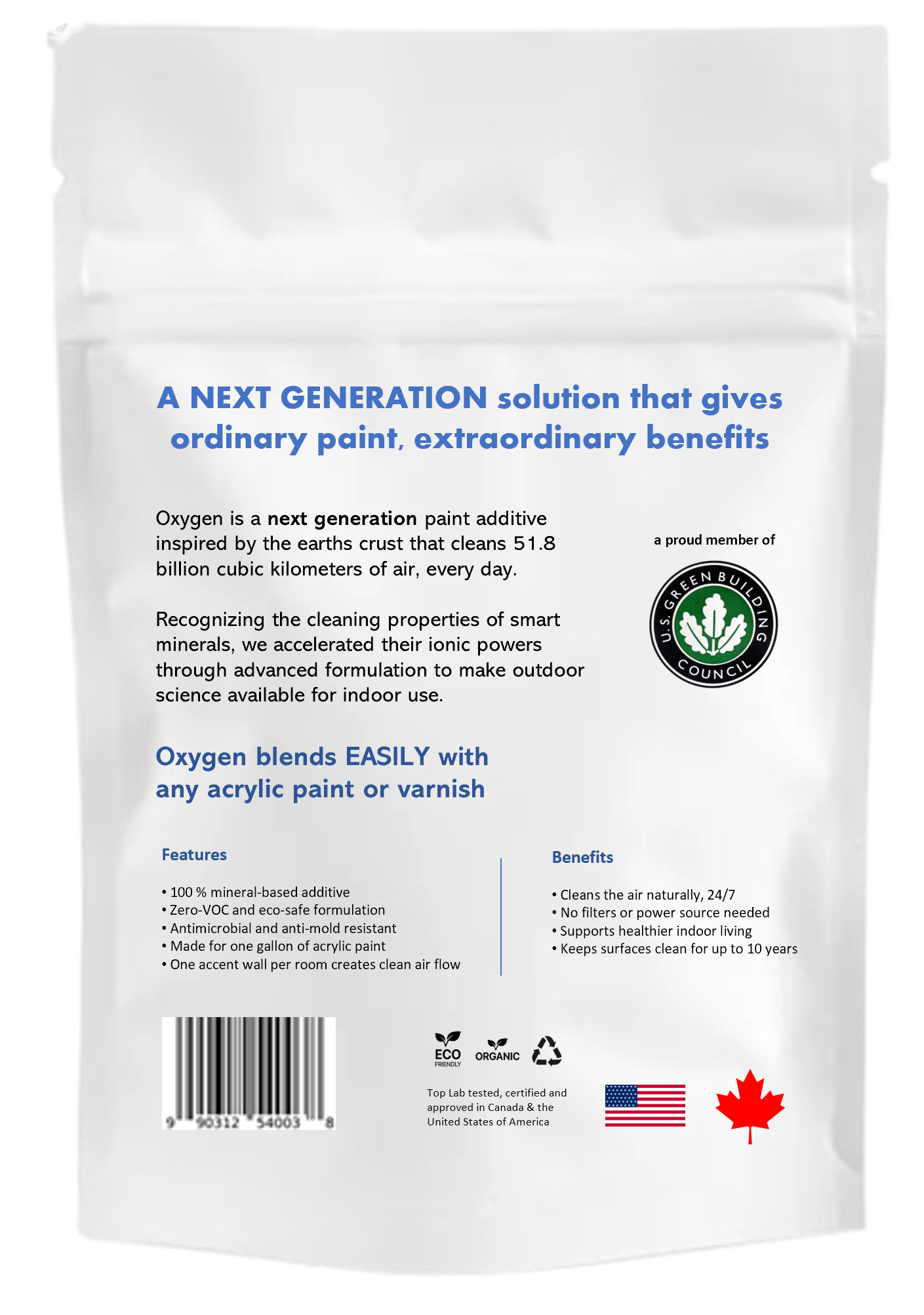 Benefits: When mixed with acrylic paint and applied on surface areas such as walls, ceilings and trims, Oxygen provides an invisible layer of protection against surface and airborne bacteria and pollution in any size room, for as long as the integrity of the paint is maintained. Oxygens specially formulated nano particles are designed to blend seamlessly into any acrylic paint, effectively capturing and neutralizing harmful elements including allergens, mold, and bad odder. Oxygen has undergone rigorous testing in top US and Canadian microbiology and disease control labs using ISO 22196 standard protocol and is proven to be a reliable and effective way to create a cleaner and more comfortable indoor environment.